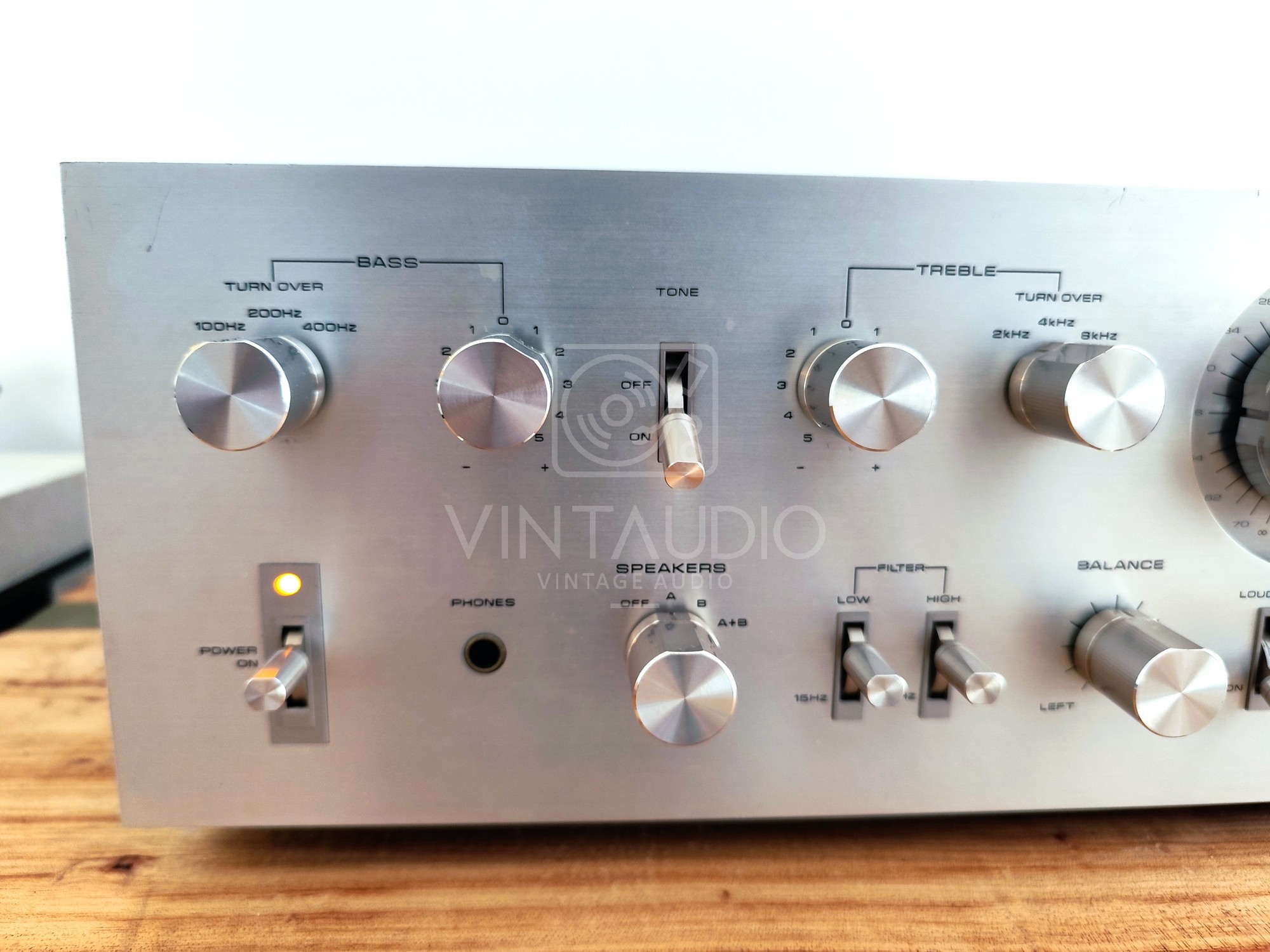 A metal chassis with a brushed aluminium front panel displays the functional aesthetic typical of Pioneer in the 1970s: dual bass/treble controls with adjustable crossover, low/high-cut filters, loudness and A/B speaker selection.